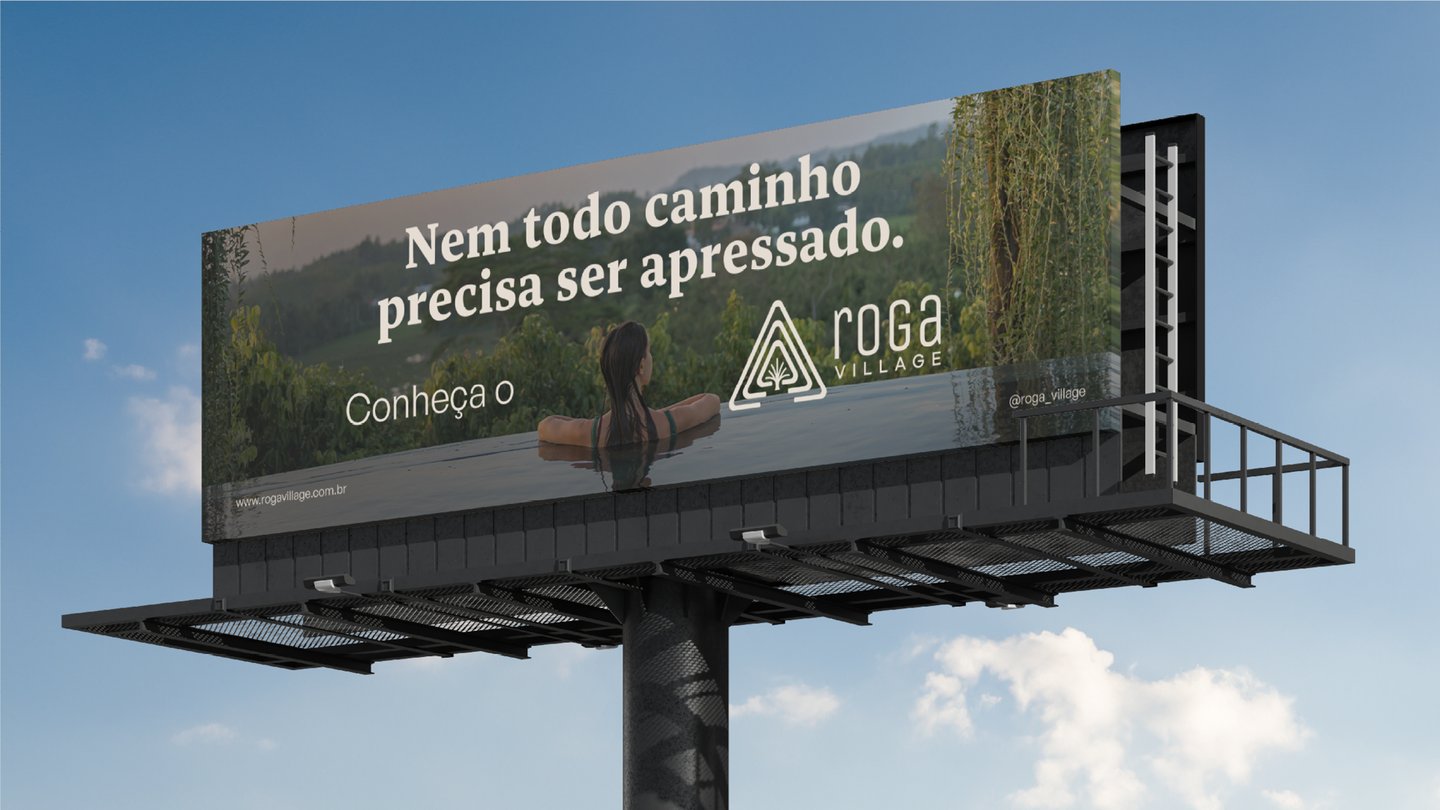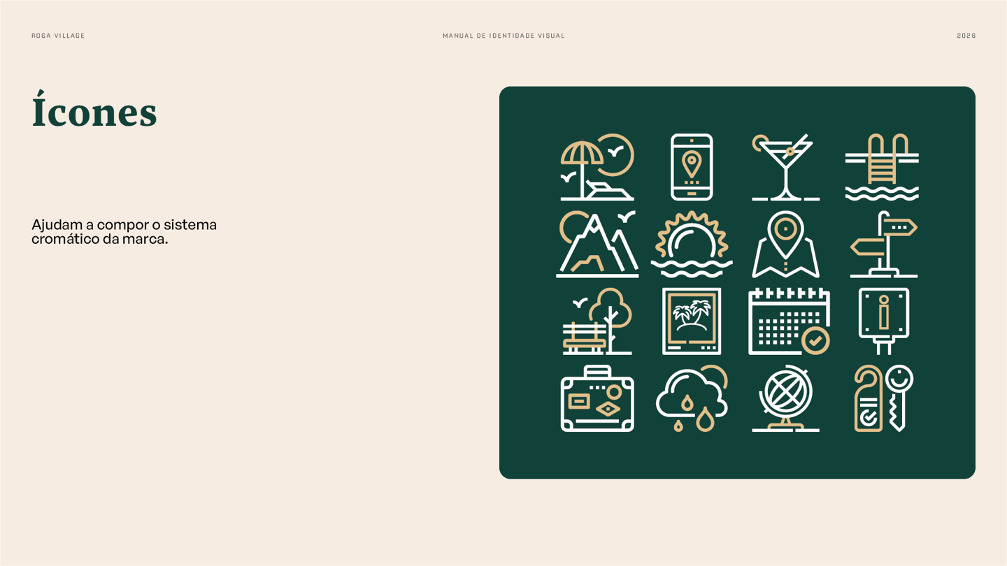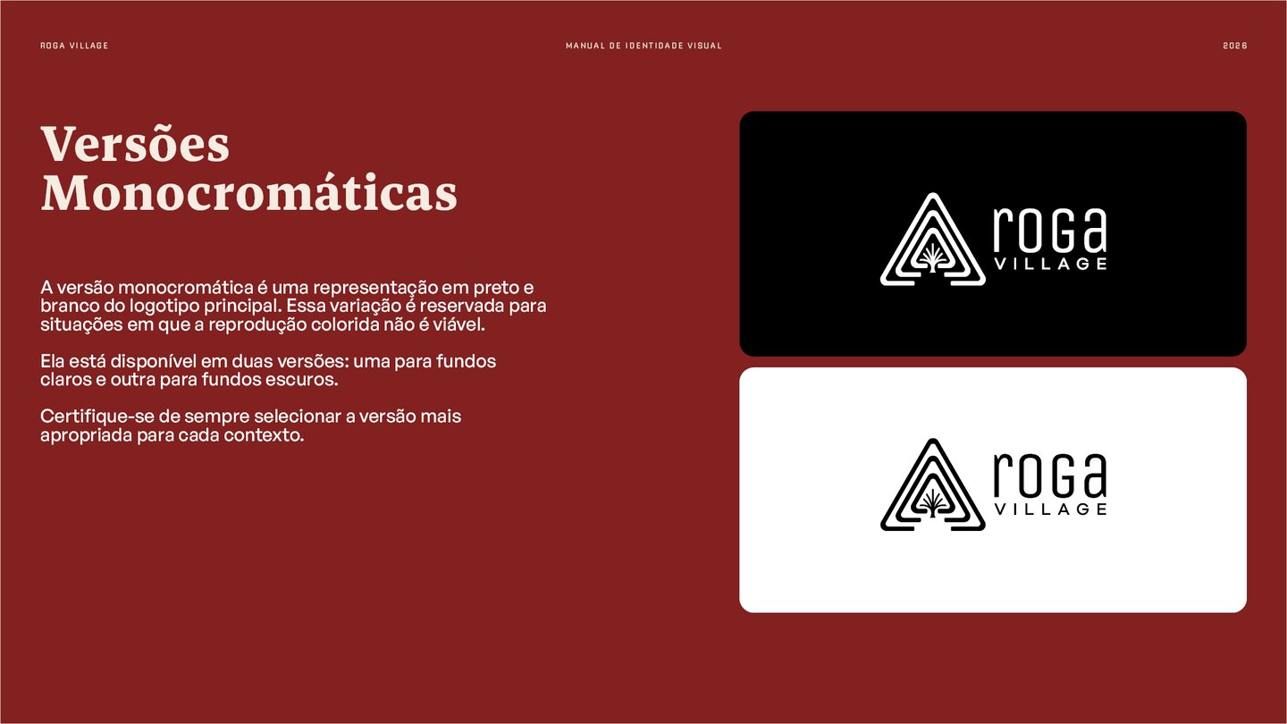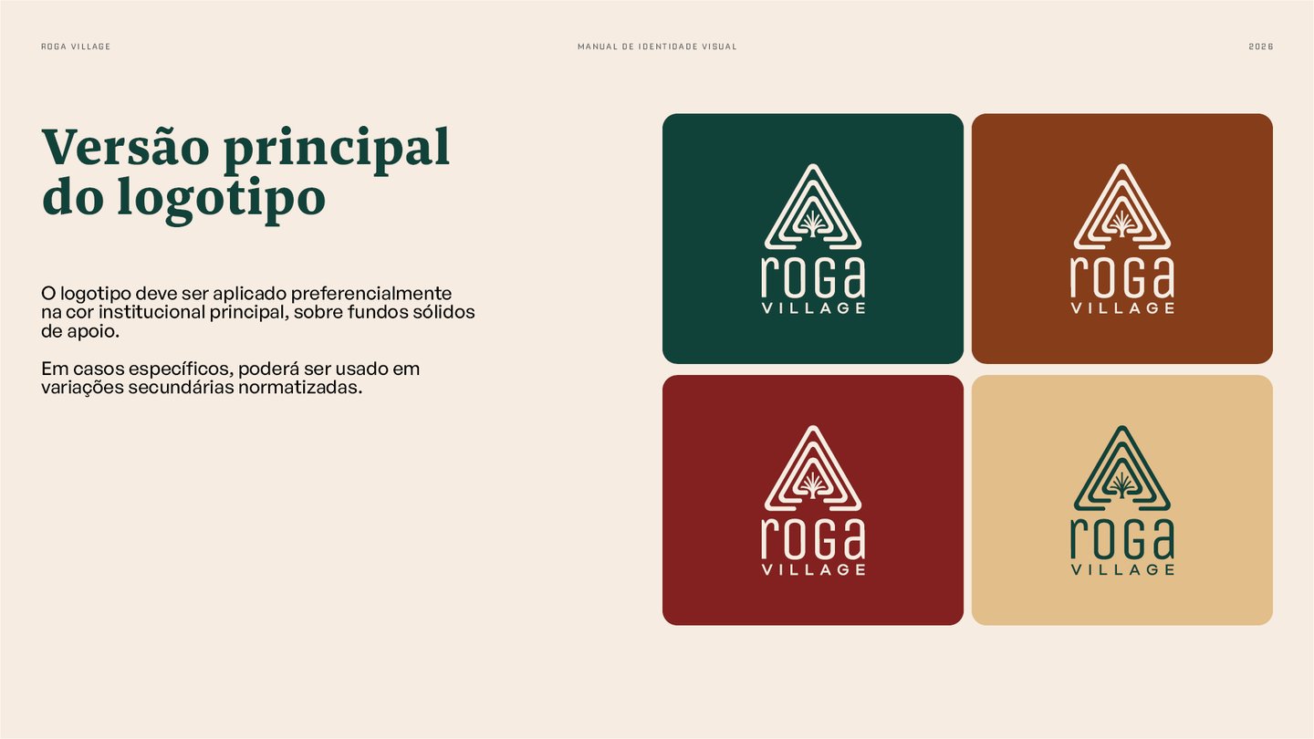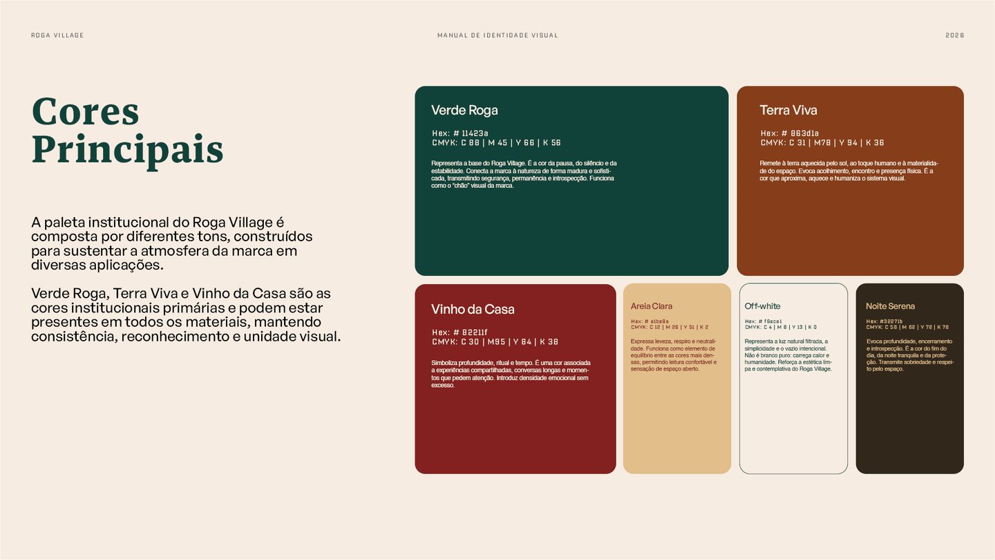 Na identidade visual, buscamos transmitir um universo orgânico, acolhedor e equilibrado. A paleta de tons terrosos e naturais conecta a marca diretamente ao seu ambiente, enquanto a arquitetura visual reflete a harmonia entre o rústico e o contemporâneo. O design prioriza a clareza e o respiro, traduzindo visualmente a sensação de silêncio e paz que o espaço proporciona, consolidando o Roga Village como um santuário de experiências memoráveis e autênticas.